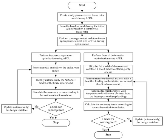 In this paper, a fully parameterized model for ventilated brake rotors is created using the ANSYS Parametric Design Language (APDL), with 22 parameters uniquely defining the rotor geometry. Then, an advanced, zero-order optimization procedure is applied iteratively on the model to maximize or minimize a predefined objective function with some constraints imposed. Two structural optimization cases are studied in this paper. The first one is a maximization problem for frequency separation between certain eigenmodes of the rotor structure. The second case minimizes the thermal deformation on both sides of the friction surfaces of the rotor with a thermal loading of heat flux generated during the braking process. A conceptual flowchart for this research is shown in Figure 1.