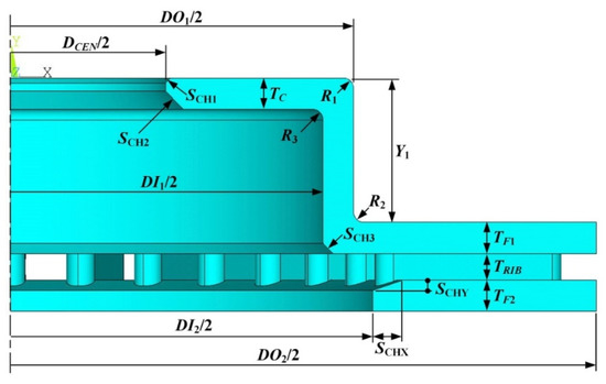 where fobj is the objective function of this optimization problem; fsep1 and fsep2 are the separation frequencies between the 6ND (f6ND) and 1T (f1T) modes and 1T and 7ND (f7ND) modes, respectively; DV contains the design variables and LDV and UDV denote the lower and upper bounds, respectively, of the design variables; Mbase is the total mass of the baseline model, Ma represents the mass of current model; εM is a small positive value. Equation (4) ensures that the mass of the optimized model will not exceed the baseline model by more than a small amount. In this study, εM was set to 1% of the baseline mass. The weight issue is always an important concern when designing automotive parts. Four design variables DI1, TF1, TF2, and TRIB were chosen based on engineering judgment and sensitivity analysis that revealed their high sensitivities. The sensitivity of a frequency fj to a design variable DVi is defined as