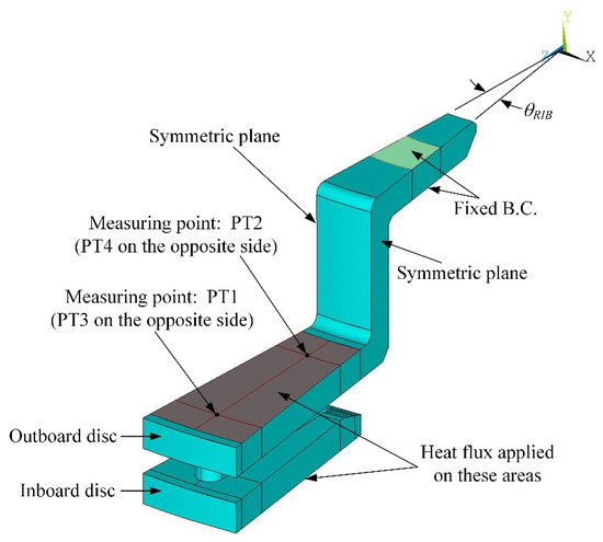 Coning of a brake rotor is caused by the thermal distortion of frictional surfaces due to uneven temperature distribution near the intersection of the hub and disc [29]. Severe brake rotor coning could result in brake system instability and is the main cause of brake judder [30]. As the second optimization case of this study, thermal deformation on the frictional surfaces of the rotor was investigated. By slicing through the baseline model while avoiding the holes on top of the hub, and taking advantage of the symmetrical feature of the rotor, a sliced model containing only one rib was created, and this reduced model with its boundary and loading conditions is demonstrated in Figure 11. The fixed BC applied on the areas on both sides of the rotor hub represents a bolted condition, which also reduced the adversity effects of the bolt holes that could hamper the symmetry assumption of the rotor. With heat flux loaded on the sliced model, deformations in y-direction at four measurement points (PT1 through PT4), which are named Uy1 through Uy4, respectively, were obtained, to calculate thermal distortion of the friction surfaces. Coning of the rotor can be represented by the differences between Uy1 and Uy2, and Uy3 and Uy4. To achieve this goal, the following steps were taken:
