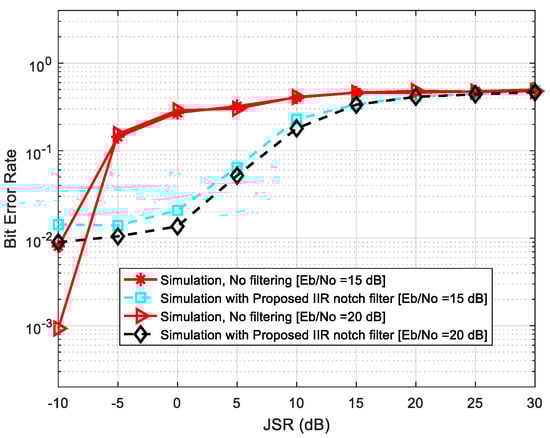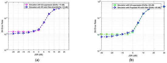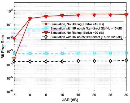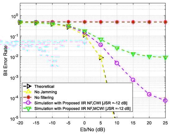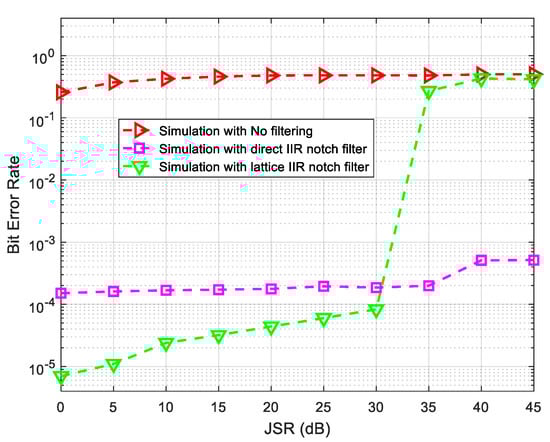 - Choi, J.W.; Cho, N.I. Narrow-band interference suppression in direct sequence spread spectrum systems using a lattice IIR notch filter. In Proceedings of the 2001 IEEE International Conference on Acoustics, Speech and Signal Processing, Salt Lake City, UT, USA, 7–11 May 2001; Volume 4, pp. 2237–2240. [Google Scholar] [CrossRef]