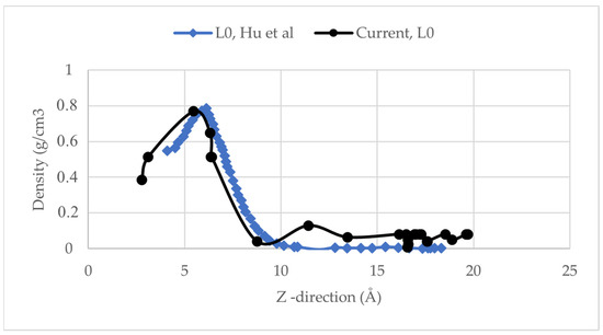 The predicted density reduction per cycle are plotted in Figure 4 as a function of the distance along the z-direction. The results are compared to those of Hu et al. [8], which studied the same physical system. As the number of deposited layers grows, both density profiles become flatter. This demonstrates that the ALD-deposited film has a lower density at the surface region in the early stages of ALD.