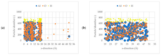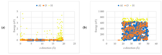 ALD deposition rule was used in this study as described by Hu et al. A monolayer was built as shown in Figure 3a–e. The simulation box was resized to produce the necessary oxide density after annealing the sample at 5000 K for 300 ps. The sample was then quenched at a rate of 47 K/ps to 300 K in 100 ps. The box was then duplicated twice in the x and y directions (to increase the system size), and the surface was formed by expanding the box length in the z-direction to 51.0 Å. To produce the appropriate H content, specified H atoms were injected above the frozen layers to generate a hydroxylated surface. An Al atom was chosen randomly and swapped with an H atom to add to the system. Simultaneously, an O atom was chosen randomly and removed to maintain the system’s overall charge neutrality. Finally, the surface was annealed for 500 ps at 1000 K. After annealing, the H atoms migrated to the surface region, resulting in a -OH terminated surface. The migration of -OH groups on the surface increases the ALD growth rate, allowing the surface to accommodate more precursor molecules to react on the surface [8,9]. The atoms in the bottom 3 Å of the simulation box were frozen at their relaxed geometries for additional simulation studies [8,27]. At that point, it is assumed that the projectile flux to the surface is sufficiently low; the sample surface can be assumed to be in equilibrium before the next hit. Since it is assumed that the duration between incoming projectiles is long enough not to affect each other, the same sample can be utilized for all simulations in this situation. This approximation can produce valuable results only if the model is in thermal equilibrium and a steady-state concerning layer growth [28].