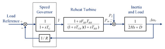 Figure 2 demonstrate the structure of frequency regulation based on the conventional frequency regulation model, where the behaviors of the speed governor, reheat turbine, synchronous generator, and electric load are included [5]. In Figure 2, R designates the droop coefficient, whose physical meaning is to properly allocate the output power of synchronous generator Pm according to the change of system frequency ωr so as to accurately share the load among various synchronous generators. TG refers to the time constant of the speed governor, and it is introduced by the time delay of the actuator. FHP, TRH, and TCH are the coefficients of the reheat turbine. Among these coefficients, TRH representing the time constant of the reheat turbine normally plays a decisive role. With a typical value of 7 s, TRH is far greater than the other coefficients [5]. H denotes the combined inertia coefficient of synchronous generator and turbine, which is defined as the ratio of rotational kinetic energy to the rated power (normally ranges from 2–10 s [5]). Its significance was emphasized many times by the previous references [21,22,23,24,25,26,27,28,29]. Generally, it is believed that the increased penetration of renewable energy resources leads to reduced system inertia, which will significantly deteriorate the frequency and angle stability of power electronics-based power systems. In order to address this issue, various approaches were proposed to increase the inertia coefficient H [7,9]. D stands for the damping factor of loads, which indicates that the power consumption of frequency-dependent loads will change when the system frequency deviates from its nominal value.