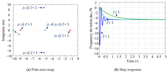 According to the classic control theory, the damping factor ζ has a great influence on the second-order system described by (1). In order to illustrate this effect, the pole-zero map and step response of GPL→ωr(s) are, respectively, demonstrated in Figure 4a,b. In Figure 4a, only zero z1 is denoted as a circle while the poles p1 and p2 are represented by crosses. As seen, for the case of ζ < 1, p1 and p2 are conjugate complex poles. One special case is ζ = 1, where p1 = p2 is satisfied. Under the condition that ζ > 1, p1 and p2 become real poles. It is noted from Figure 4b that as ζ increases from less than one to be greater than one, oscillations of system frequency gradually disappear.