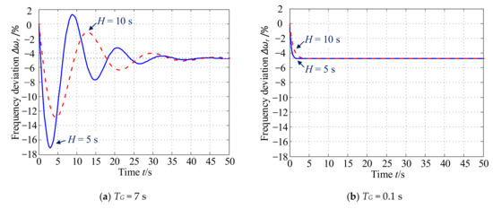 The frequency responses of systems with TG = 7 s and TG = 0.1 s under a step-up load change are, respectively, demonstrated in Figure 6a,b. As indicated by Figure 6a, frequency oscillations are observable and can be attenuated with a larger inertia coefficient H because the damping factor ζ increases as H increases, which is consistent with the conclusion drawn from Figure 5. In contrast, it can be noted from Figure 5a and Figure 6b that the damping factor ζ becomes larger than one for the case of TG = 0.1 s when H = 5 or 10 s. In this case, no oscillation is observable. The only effect of increasing H is to prolong the dynamics of frequency regulation. Therefore, it is possible to employ a small H under this condition.