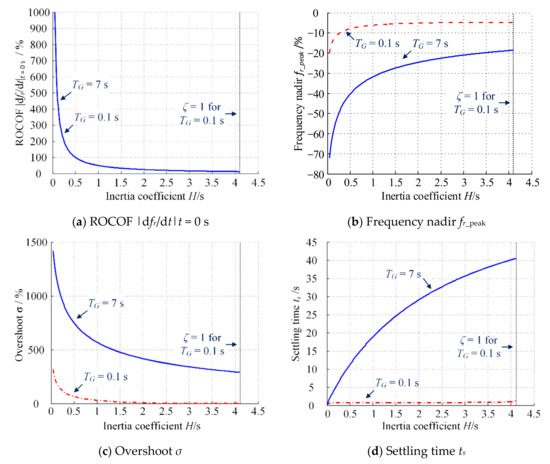 Based on (11)–(15), variations of important performance indices, including the ROCOF, frequency nadir, overshoot, and settling time, versus inertia coefficient H, are presented in Figure 7. In Figure 7, both the diagrams of TG = 7 s and TG = 0.1 s are provided. As mentioned before, for the case of TG = 7 s, the damping factor ζ < 1 will always be satisfied. In contrast, ζ < 1 remains valid when H < 4.1 s for the case of TG = 0.1 s, and this condition can be derived from Figure 5a. As can be observed from Figure 7a, the ROCOF |dfr/dt|t = 0 s decreases dramatically with the increase of H. A similar conclusion is also applicable to the absolute value of frequency nadir |fr_peak| and overshoot σ, which are inversely proportional to H, as indicated by Figure 7b,c. Additionally, it is noted from Figure 7d that the settling time ts increases with the increase of H, which is reasonable since a large inertia coefficient would slow down the frequency dynamics. It can be concluded from the above analysis that a large H helps to reduce the ROCOF, frequency deviation, and overshoot at the expense of increased settling time for the case of ζ < 1.