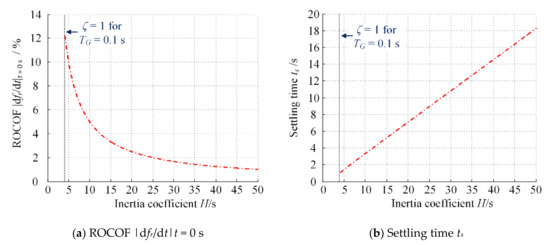 For the case of ζ > 1, variations of performance indices versus the inertia coefficient H are demonstrated in Figure 8. As compared with Figure 7, performance indices of frequency nadir and overshoot are excluded from Figure 8 because they are not meaningful due to the elimination of oscillations. Additionally, only the case of TG = 0.1 s is analyzed here as TG = 7 s will always lead to ζ < 1. As can be seen from Figure 8a, the inverse proportional relationship between the ROCOF and inertia coefficient H remains unchanged. However, it is clear that the ROCOF is greatly reduced as compared with that shown in Figure 7a. In other words, the ROCOF may not be a serious consideration for overdamped systems. Moreover, it is noted from Figure 8b that the settling time increases linearly with the increase of inertia coefficient H when ζ > 1. In conclusion, a larger inertia coefficient H will increase the settling time and slightly reduce the ROCOF for the case of ζ > 1.