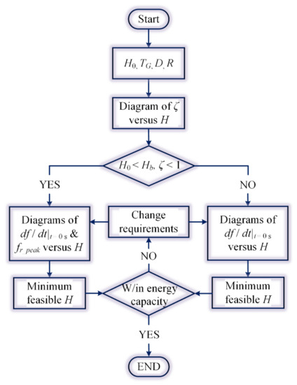 The third design step will be different for different cases. In the ζ < 1 case, the diagrams of ROCOF and frequency nadir or overshoot should be drawn according to (11) and (13) or (14), respectively, as shown in Figure 7, in the third step. From this figure, the minimum value of H required by ROCOF and frequency nadir or overshoot is finally selected in the fourth step; this H also guarantees a relatively small value of ts. Moreover, the maximum capacity of energy storage units dictates the maximum possible value of H. If this maximum value is less than the selected H, requirements should be modified, and H should be selected again. For the cases of ζ = 1 and ζ > 1, the frequency nadir or overshoot will not exist, as mentioned in Section 3. Moreover, the satisfaction of requirements dictated by ROCOF can be relatively easy. It is possible to validate this requirement through plotting the diagram of ROCOF versus H based on (27), as shown in Figure 8a. Considering that the settling time should be as low as possible, H = H0 is normally the result of design for these cases.
