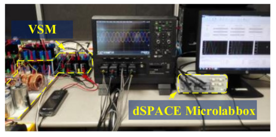 Based on the system parameter values listed in Table 1, experiments were carried out on a 1-kW three-phase VSM prototype to validate the effectiveness of the proposed inertia analysis and design method. Figure 10 illustrate a photo of the experimental prototype. As seen, a three-phase LC-filtered power electronic converter was employed as the hardware of the VSM, while the control algorithms were executed on a dSPACE control platform (dSPACE Microlabbox). For simplicity, the VSM acts as the only generator fed by resistive loads, where transmission lines, transformers, and other factors are ignored. The energy storage of the VSM emulates the kinetic energy of the synchronous generator to support the islanded grid for frequency regulation. The frequency regulation structure of the VSM is presented in Figure 3, where the frequency variation signal Δωr was integrated to obtain the angle signal Δθ. Then the ac output voltage reference Varef of the VSM can be determined according to Δθ. A standard double-loop controller, i.e., outer voltage-loop and inner current-loop controller, was incorporated to achieve the voltage control of the VSM, and its design guideline can be found in [30].