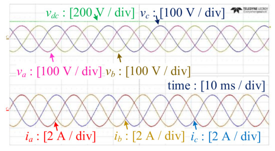 Figure 11 demonstrate the steady-state experimental waveforms of the VSM. As seen, the VSM provides voltage support through converting the constant dc-link voltage vdc into three-phase ac output voltages vx (x = a, b, c) of sinusoidal waveforms. In the steady-state where the generated power, rated power of the VSM, and load power are equivalent, the frequency of vx (x = a, b, c) is the rated frequency of 50 Hz. Since the load is purely resistive, the waveforms of load current follow those of ac voltages.