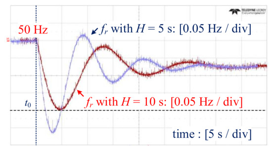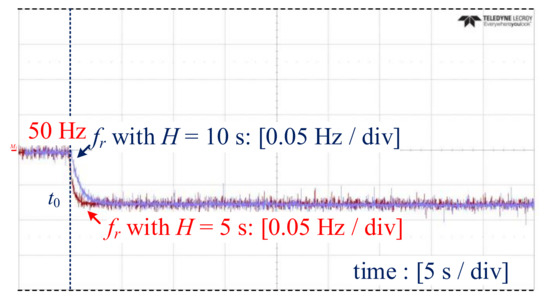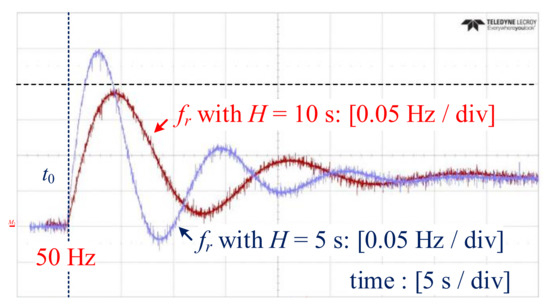 To further illustrate this point, frequency responses of the VSM under a 3% step-down load change when TG = 7 s and TG = 0.1 s are, respectively, presented in Figure 14 and Figure 15. Under this frequency event, the frequency fr becomes larger than its nominal value of 50 Hz. Nevertheless, the expressions of performances indices derived in Section 3 are still applicable, and similar conclusions can be drawn from these figures. For the underdamped system (see Figure 14), a larger inertia coefficient is desirable as it translates into fewer oscillations. In contrast, a smaller H is preferable for the overdamped system (see Figure 15) because it allows faster frequency recovery.
