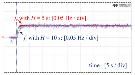 Based on the system parameter values H0 = 5 s, D = 1.0, and R = 0.05 listed in Table 1, two cases of TG = 7 s and TG = 0.1 s are, respectively, designed to comply with the requirements of ROCOF ≤ 0.5 Hz/s and frequency nadir within 50 ± 0.2 Hz under a 3% step-up load change. These requirements are translated into |fr_peak| ≤ 13.3% and |dfr(t)/dt| t = 0 s ≤ 33.3% under a 100% load change. In the case of TG = 7 s, according to (11) and (13), the minimum feasible value, i.e., the selected value, of H is 10 s. In contrast, for the case of TG = 0.1 s, the requirements can be easily satisfied with H = H0 = 5 s.