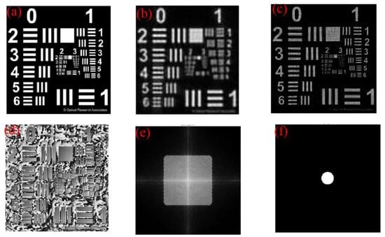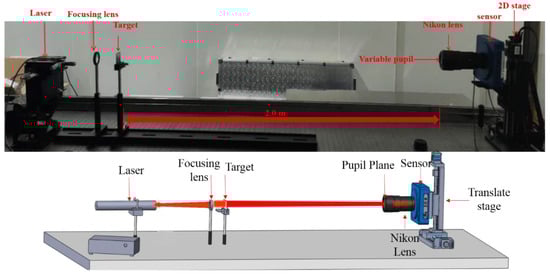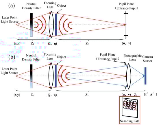 As shown in Figure 1a, the laser point light source emits a divergent spherical wave that propagates to the focusing lens and becomes a converging spherical wave, illuminating the object imaged at the pupil plane. In this experiment, in order to effectively control the system energy, we placed a neutral density filter behind the laser point light source. The distance between the light source and the focusing lens is , and the distance between the object and the pupil plane is . The amplitude distribution of the object near the focal position of the point light source is the Fraunhofer approximation pattern, which is located at the pupil plane (entrance pupil) of the photographic lens.
