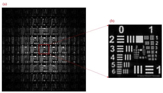We further processed the images with a scanning step of 2 mm with partition reconstruction, which involved cutting the image into smaller objects for reconstruction. We chose to intercept the central position objects of each LR image for reconstruction. The above algorithm was used to reconstruct the intercepted images again, and the reconstruction results are shown in Figure 13. From the results, we found that the partition reconstruction can effectively reduce the effect of the aberrations and reconstruct smaller feature with higher image quality than HR image reconstructed by full-frame reconstruction. Partition reconstruction yields better results than full-frame reconstruction. For example, full-frame reconstruction can only resolve the feature of Group 17 on the object, as shown in Figure 12, while partition reconstruction can even resolve Group 25 with a 40 μm line width of 12.5 lp/mm and a resolution gain of 4×.