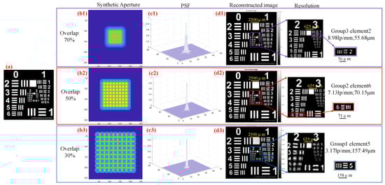 Image reconstruction effect of the original image under different degrees of overlap ratio. (a) The ideal original image; (b1) the synthetic aperture under 70% overlap ratio; (b2) the synthetic aperture under 50% overlap ratio; (b3) the synthetic aperture under 30% overlap ratio; (c1) the system PSF image under 70% overlap ratio; (c2) the system PSF image under 50% overlap ratio; (c3) the system PSF image under 30% overlap ratio; (d1) the intensity image with high-resolution under 70% overlap ratio; (d2) the intensity image with high-resolution under 50% overlap ratio; (d3) the intensity image with high-resolution under 30% overlap ratio.