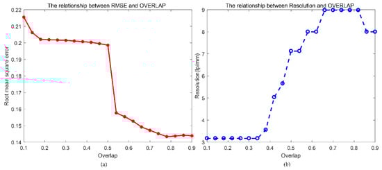 Effect of varying overlap between adjacent images on RMSE and resolution of HR image. (a) the RMSE plot of HR intensity image; (b) the resolution plot of the different overlap ratio.