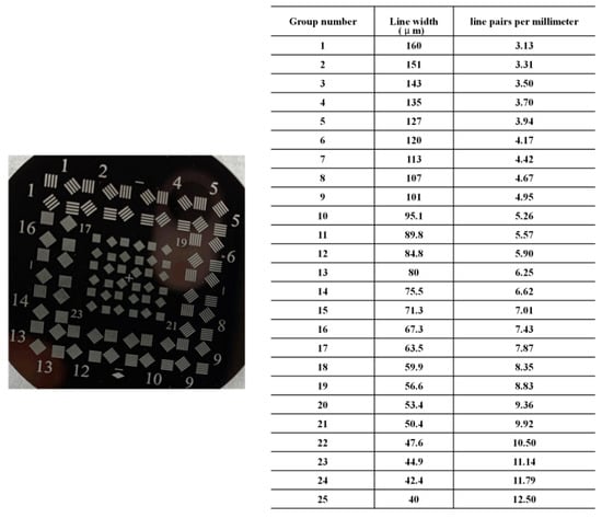 Our imaging system consists of a high-performance cooled CCD (Belfast, UK, Apogee Alta F16000 Compact, 15.8 Megapixel CCD) coupled with a 180 mm Nikon photographic lens (Tokyo, Japan, AF NIKKOR 180MM F/2.8, IF-ED), which was mounted on a motorized 2D stage (Shanghai, China, GCD-20330M, see Figure 8). The total travel of the 2D stage was 300 mm with an accuracy of 0.1 μm. The object was located 2 m away from the pupil plane of the lens and illuminated by a 808 nm laser with a multimode fiber near-infrared semiconductor (Changchun, China, CNI, MDL-Ⅲ-808 nm-1W-19121367). The coherent light beam emitted by the laser light source directly illuminated the focusing lens (f1 = 150 mm) and was imaged to the variable pupil plane of the Nikon imaging lens after passing the object with 20 mm × 20 mm (Shanghai, China, RealLight, RT-GBA1-TNS001). In addition, the object image and the corresponding data chart are shown in Figure 9. As shown in Figure 9, the object of the experiment, which is shown on the left and tagged with No. 1 to No. 25, had a total of 25 groups of stripes, and the line width and frequency of each group that indicate the resolution increases in turn are shown in the chart. The camera sensor received a series of LR intensity images, which was the inverse Fourier transform of the object spectrum at different locations.
