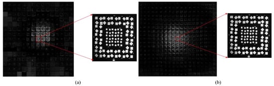 Figure 11 is the dataset under multiple acquisitions showing different results under two different far-field FP experimental setups. Figure 11a, with a scanning step of 4.5 mm and 61% overlap ratio, is an original sequence image composed of 225 LR images with 160 μm line width and 3.13 lp/mm resolution. Figure 11b, with a scanning step of 2 mm and 84.5% overlap ratio, shows a set of images with 361 LR intensity images with the same resolution.