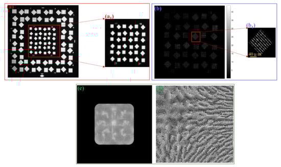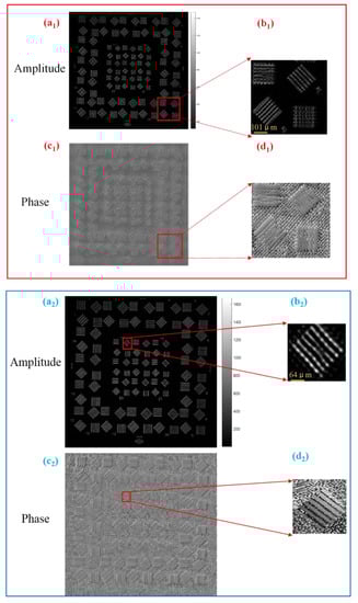 In Figure 12, the images in the red box were recovered from 225 LR images with 231 pixel × 231 pixel and a scanning step of 4.5 mm. Using a personal computer (9th Generation Intel Core i7), we found the single iteration time to be 3 s, and the data converged after 10-15 iterations. The total recovery time was approximately 30~45 s. The reconstructed detailed information of the object is shown in Figure 12(a1,b1). Figure 12(c1) shows the phase of the reconstructed HR image. Figure 12(d1) shows the zoomed-in phase of Group 9 HR image. Meanwhile, the images in the blue box were recovered from 361 LR images with 231 pixel × 231 pixel with a scanning step of 2 mm. The single iteration time was 5 s, and the data converged after 15~25 iterations. The total recovery time was approximately 80–130 s. Group 17 of the HR object (Figure 12(a2)) is shown in Figure 12(b2). Figure 12(c2) shows the phase of the reconstructed HR image. Figure 12(d2) shows the zoomed-in phase of Group 17 HR image. The recovery algorithm with a longer scanning step has a shorter running time and higher efficiency.