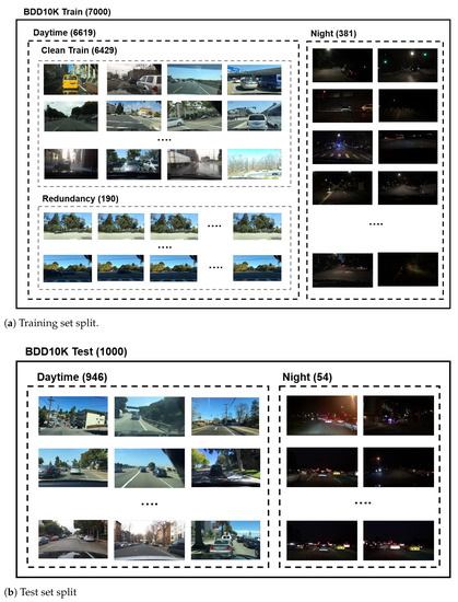 Our BDD10K dataset preparation. (a) The original BDD10K dataset provided 7000 examples of the training set. We first ignored 381 examples taken at night and did not use these examples for our experiment. We defined redundant examples as those that exhibited similar visual contents in multiple frames (at least four frames). In this regard, we identified 190 redundant examples from the original training set (see redundancy). We split these redundancies from the original training set and regarded the remaining examples as a clean training set. Consequently, we prepared the original training set to obtain a clean training set and a redundancy set. (b) Similar to the training set, we removed 54 examples taken at night from the original BDD 10 K test set. Thus, we obtained 946 examples for testing.