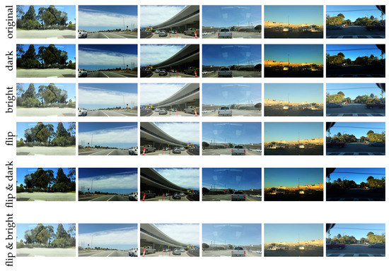 Augmentation results for redundant examples of BDD10K. Original examples (top row), and darkness (second row), brightness (third row), flipping (fourth row), flipping followed by darkness (fifth row), and flipping followed by brightness (bottom row) augmentation results for the original examples.