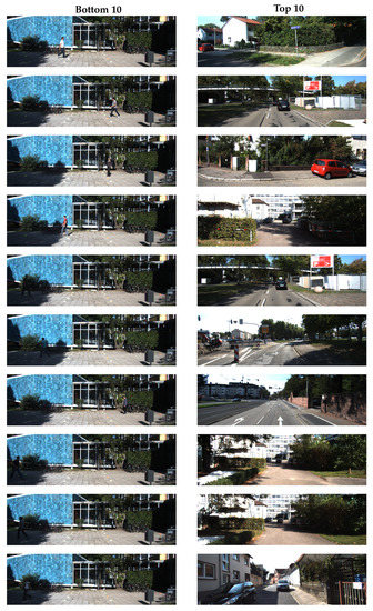 Visual inspection for KITTI. In total, 10 examples with a bottom coreset score (left column) showed a similar appearance. A total of 10 examples with a top coreset score (right column) were dissimilar in appearance to each other.