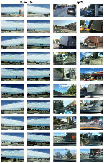 Visual inspection for BDD10K. In total, 20 examples with a bottom coreset score (left column) showed a similar appearance. A total of 20 examples with a top coreset score (right column) were dissimilar in appearance to each other.