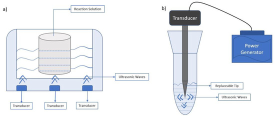 Differently from low-intensity US, this type of US is considered disruptive, since it produces significant modifications on the physical, biochemical, and mechanical properties of food products [52]. US produces bubbles that undergo collisions. Consequently, these generate cavitation phenomena, resulting in high temperature and pressure up to 5000 K and 50 MPa, respectively [53]. Hence, changes in the pH, stress, temperature, and pressure are caused by these strong explosions and high temperatures. In addition, these changes in an enzyme environment can imply the inactivation of enzymes due to the modifications in the enzyme structure caused by destruction of van der Waals binding and hydrogen bonding, which result in loss of enzyme activity [54,55]. Commonly used devices that produce US are the US probe and US bath, as represented in Figure 3.