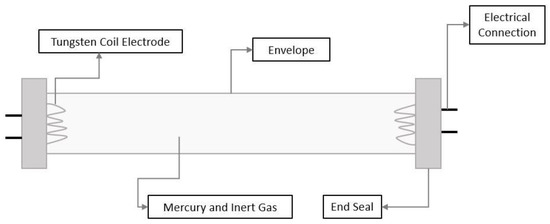 UV light is the part of the electromagnetic spectrum in the range from 200 to 400 nm, and it can be divided into three regions: from 200 to 280 nm, UV short wave (UV-C); from 280 to 320 nm, UV medium wave (UV-B); and from 320 to 400 nm, UV long wave (UV-A). Light is emitted from a gas discharge at wavelengths characteristic of the elements that compose the gas itself as well as the excitation, ionization, and kinetic energy of them. A gas discharge is a mixture of excited atoms, nonexcited atoms, cations, and electrons generated through a high voltage applied across a volume of gas. A schematization of UV lamp is shown in Figure 4.