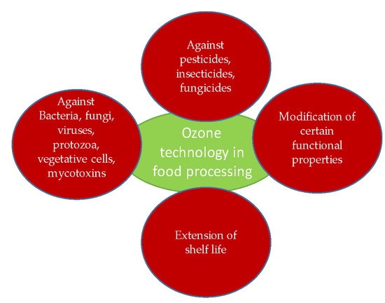 The use of ozone (O3) in the food industry has become widespread as it acts primarily as a disinfectant against a variety of microorganisms but also as a means of shelf-life extension of many foods. Meat [134,135], poultry [136], eggs [137], seafood [138], fruits [139,140], vegetables [141,142,143,144,145], juices [146], spices and herbs [147,148], dairy and dairy products [149], and dry foods have been treated with ozone for different purposes, among them sanitization and disinfection purposes [150,151]. Ozone as a non-thermal treatment has great antioxidant activity against bacteria, fungi, viruses, protozoa, and vegetative cells [152,153]. Ozone destroys microorganisms by gradually oxidizing vital cellular components, starting first with the sulfhydryl groups and amino acids, contained in proteins and enzymes, and continuing with the oxidation of polyunsaturated fatty acids [154]. Ozone also has significant antioxidant activity against mycotoxins, which are highly toxic substances formed in a variety of agricultural products [155,156,157], at all stages of their distribution and marketing [158], with the processed products showing little or no chemical residues and pollutants [159]. Ozone has also been shown to modify certain functional properties of foods. Increased shelf life, improved texture, as well as reduced viscosity are some of the effects of ozonation on starch modification in various starch sources such as rice, corn, potato, cassava, and wheat sources [151]. Figure 5 presents the main uses of ozone technology in food processing.
