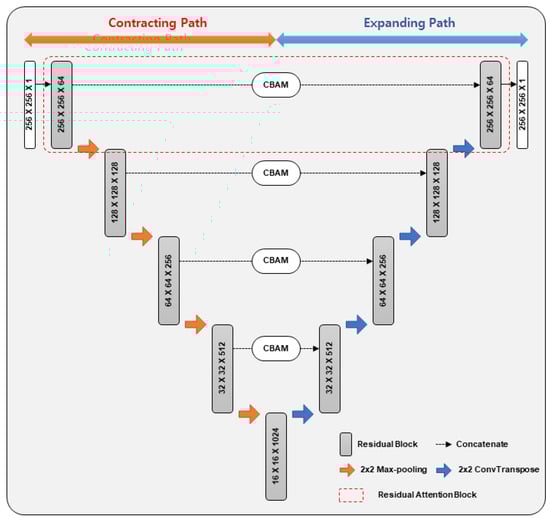 The contracting path consists of four residual blocks and four 2 × 2 max pooling layers. The input image is a 256 × 256 resolution black-and-white image with one channel. The residual block consists of two 3 × 3 convolution layers, batch normalization following each layer, and ReLU activation functions. In the first residual block, the 256 × 256 × 1 input image is extracted as a 256 × 256 × 64 feature map. Then, the size of the feature map is halved, and the number of channels is doubled by the down-sampling of the max pooling layer, which then has a 32 × 32 × 512 feature map of four residual blocks through the contracting path.
