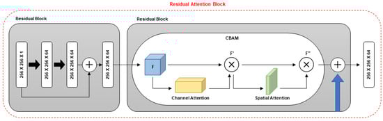 Figure 3 shows the structure of the residual attention block. Residual block is a structure used in ResNet as designed by Kaiming et al. []. It is a simple idea that takes the input as it is and adds it to the learned function as a method designed to solve the problem of inferior performance caused by the gradient vanishing as the layer of the model gets deeper.