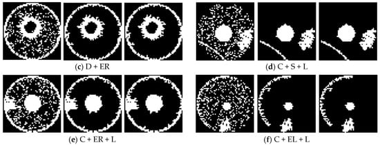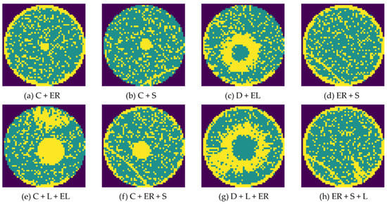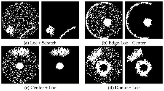 We intended to identify not only single defects but also mixed-type defects. Therefore, to assess the performance of the model, we used Mixed-type Wafer Defect Datasets provided by the Institute of Intelligent Manufacturing and Donghua University as a part of the test data []. This dataset is a wafer map dataset collected from a wafer fabrication plant, obtained by testing the electrical performance of each die on the wafer using test probes. We used mixed-type defects as test data to find out how well the proposed model could detect mixed defects. We used the two-mixed type, in which two defects are combined, and the three-mixed type, in which three defects are combined. However, we excluded the combination of Center and Donut from the experiment, because it may have many locations or overlapping parts; we also excluded Edge-Ring and Edge-Loc for the same reason. For mixed-type defects, we randomly extracted 2400 pieces of data and used 1200 of them; these included both two-type and three-type defects. Figure 5 shows the mixed-type defects visually.