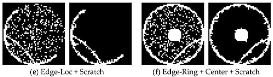 Results of mixed-type defect masking: (a) Loc + Scratch defect; (b) Edge-Loc + Center defect; (c) Center + Loc defect; (d) Donut + Loc defect; (e) Edge-Loc + Scratch defect; (f) Edge-Ring + Center + Scratch defect.