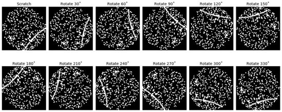 We applied rotational data augmentation to improve the performance of the model. Data augmentation is a simple but easy way to improve the performance of deep neural networks. In this study, we adopted the image rotation method. First, we randomly extracted 100 single defects for each class, balanced the data, and then rotated them by 30 degrees. Figure 8 shows the results of rotation data augmentation, by which we were able to increase the size of the training dataset by 12 times.