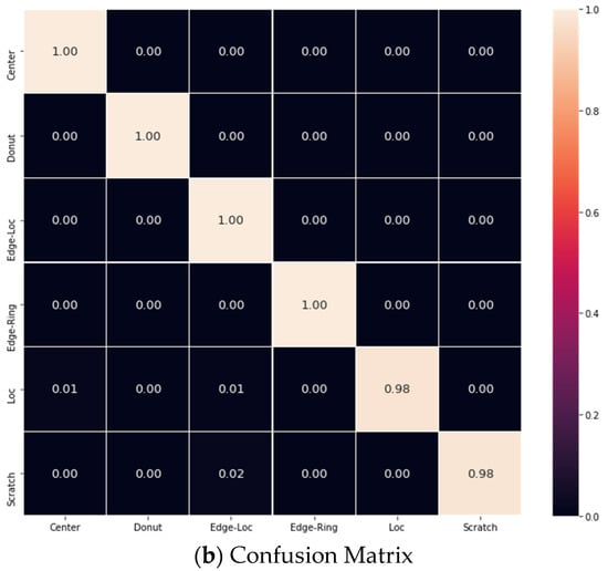 Testing results of single defects: (a) testing accuracy graph. The accuracy of the model according to the epoch is shown; (b) normalized confusion matrix (Center, Donut, Edge-Loc, Edge-Ring, Loc, Scratch).