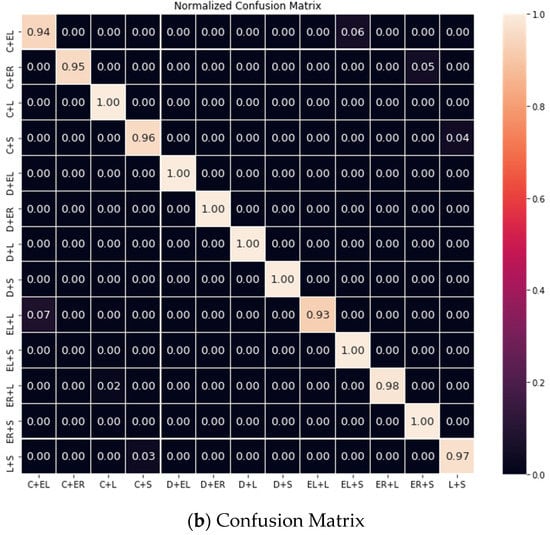 Testing results of mixed-type defects: (a) testing accuracy graph. The accuracy of the model according to the epoch is shown; (b) normalized confusion matrix (C + EL, C + ER, C + L, C + S, D + EL, D + ER, D + L, D + S, EL + L, EL + S, EL + L, ER + S, L + S).