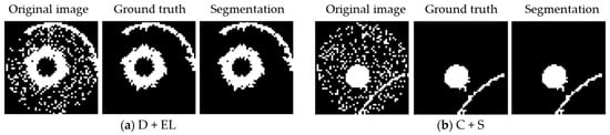 For the mixed defects, the left image is a black-and-white conversion of the original image, and the right image is the result of masking. For the mixed defects, as shown in Figure 7, when the defects are separated, they are well distinguished. Both the two-mixed and three-mixed defects were mostly correctly distinguished. However, if the defects are closely connected or small, they can be recognized as a single defect. Therefore, for accurate verification, we excluded cases that could not be distinguished well from the test dataset.