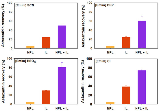 Notably, using α-quartz NPLs in room-temperature IL-mediated extraction, the astaxanthin recovery from H. lacustris cysts improved significantly (49.8% for [Emim] SCN, 60.0% for [Emim] DEP, 80.7% for [Emim] HSO4, and 74.3% for [Emim] Cl) (Figure 2). These values were 4.4, 6.1, 8.4, and 5.2 times higher, respectively than obtained with the IL treatment alone (Figure 1). This finding clearly demonstrated that the cell-wall-lacerating effect of α-quartz NPLs increased the cell wall permeability and astaxanthin extraction potential of the four [Emim]-based ILs from rigid H. lacustris cysts. It also suggests that α-quartz NPLs can be considered as effective cell-wall-disrupting tools for the application of custom-designed ILs in the extraction of various products, including edible oils, fragrances, biopolymers, biodiesel, bio-jet fuel, bioethanol, and biogas, using algal biorefineries [2,20,30,31].