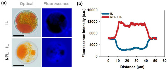 IL uptake by H. lacustris cyst cells was further analyzed by fluorescence microscopy based on the fluorescence of [Emim] HSO4 at approximately 450 nm. Several areas of weak blue fluorescence were observed inside the IL-treated cysts not treated with α-quartz NPLs. Instead, the outer layer of the cyst cell exhibited a strong blue fluorescence owing to the binding of [Emim] HSO4, which indicated a significant barrier effect of [Emim] HSO4 on the algal cell wall (Figure 4a). In contrast, H. lacustris cyst cells subjected to NPL-assisted IL treatment were able to sufficiently absorb [Emim] HSO4 and emitted stronger cytoplasmic blue fluorescence than cells treated with IL alone. The average blue fluorescence intensity of the former was approximately 4.3 times higher than that of the latter (Figure 4b). Along with the astaxanthin recovery results (Figure 2), these results demonstrate the synergistic effect of α-quartz NPLs and [Emim]-based ILs in astaxanthin extraction from H. lacustris cysts with a rigid cell wall structure.