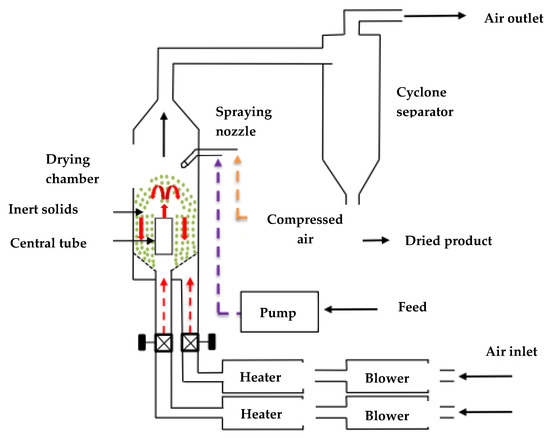 - Osorio-Revilla, G.; Elías-Serrano, R.; Gallardo-Velázquez, T. Drying of liquid feedstocks in a spout-fluid bed with draft-tube submerged in inert solids: Hydrodynamics and drying performance. Can. J. Chem. Eng. 2008, 82, 142–147. [Google Scholar] [CrossRef]