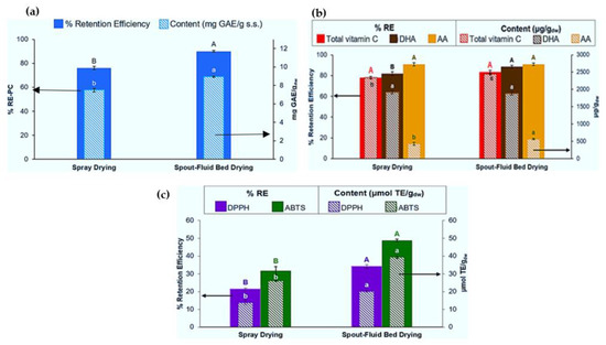Content and retention efficiency of bioactive compounds and antioxidant capacity in microcapsules. (a) PC; (b) AA, DHA and total vitamin C; (c) antioxidant capacity (ABTS and DPPH). Data are expressed as the mean ± standard deviation of the analysis in triplicate. The arrows indicate the axis to which the bars belong. RE: retention efficiency; PC: phenolic compounds; AA: ascorbic acid; DHA: dehydroascorbic acid. Different capital letters of the same color indicate significant difference of RE between spray drying and spout-fluid drying, and lower-case letters of the same color indicate significant difference in the content between spray drying and spout-fluid drying.