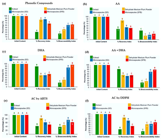 Recovery and Bioaccessibility indices of bioactive compounds and antioxidant capacity of microcapsules obtained by spray dried and spout-fluid bed. (a) Phenolic compounds (PC); (b) ascorbic acid (AA); (c) dehydroascorbic acid (DHA); (d) total vitamin C (AA+DHA); (e) antioxidant capacity by ABTS; (f) antioxidant capacity by DPPH. Data are expressed as the mean ± standard deviation of the analysis in triplicate. SD: spray drying; SFB: spout-fluid bed drying; AC: antioxidant capacity. Different capital letters indicate significant difference in the same sample (extract, microcapsules and dehydrated Mexican plum powder), and lower-case letters indicate significant difference between group (initial content, recovery index and bioaccessibility index).