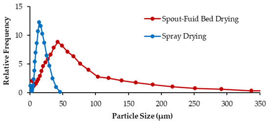 Particle size distribution of microcapsules obtained by SD and SFB is shown in Figure 5. As can been seen in Figure 5, a unimodal and narrow distribution was obtained for the microcapsules obtained by SD with particle size ranging from 1.22 to 46.40 μm, while the microcapsules by SFB had a unimodal and wide size distribution with particle size ranging from 3.65 to 350 μm. Similar values were obtained by Morais et al. [17] with particle size between 0.579 and 44 μm in microcapsules by spray drying of S. purpurea extract, and by Costa et al. [48] with particle size between 0.06 and 600 μm in microcapsules obtained by spout fluid bed drying of Euterpe oleracea extract.