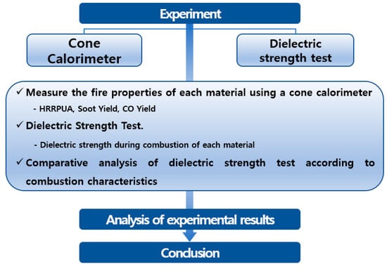 This study was conducted according to the procedure in Figure 1. First, we measured the fire properties of each material using a cone calorimeter. Second, we analyzed the breakdown of insulation that occurred when a material was burned using the dielectric strength test. Finally, we confirmed the correlation between the two experimental results through correlation analysis.
