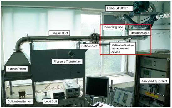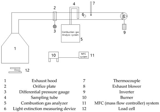 Figure 2 is a schematic layout of the cone calorimeter, and Figure 3 shows the components of the cone calorimeter. The cone calorimeter used the oxygen consumption method to calculate caloric values. The oxygen consumption method is based on the theory that the amount of heat and oxygen that is consumed from the air during combustion is such that a fixed caloric value of 13.1 MJ is emitted per 1 kg of oxygen. In addition, the gas types and yield values that were generated during the combustion process were compared to the mass reduction rate, and the production rate was quantified. The KS F ISO 5660 standard experimental device was used to measure and analyze the ignition properties of experimental materials, including three types of polymers, cypress, medium density fiberboard, and heptane [].