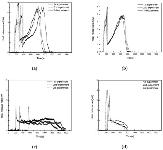 (a) PP HRR, (b) PE HRR, (c) cypress HRR, (d) Douglas fir HRR.