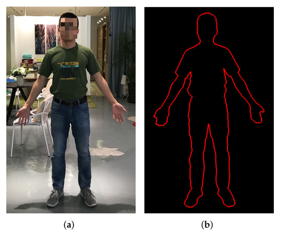 Human body profiling can be widely used in many fields, such as ergonomics, clothing technology and computer graphics. The estimation of image-based human body profiles can be regarded as a fine-grained semantic segmentation problem. However, current image segmentation methods [1,2,3] have several drawbacks when applied to body profile estimation. On the one hand, the existing segmentation datasets usually label the contours of each person with clothes and the annotation result is shown in Figure 1b. Therefore, they cannot obtain an accurate result, as the precise body profile is invisible, being covered by clothes. On the other hand, although the human profile can be segmented by a closed boundary that is approximated by polygons, human labelers have to accurately click on numerous boundary points to obtain an accurate human profile, especially for invisible parts covered by clothes.
