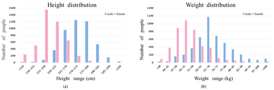Analysis of the contour keypoint dataset: (a) is height distribution and (b) is weight distribution.