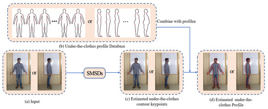 Our DeepProfile method involves two stages. First, we utilize a CNN with SMSD blocks to extract high-precision human body contour keypoints. Then, we combine both contour keypoints and the under-the-clothes profile database [5] to generate accurate under-the-clothes body profiles. The overview of our method is shown in Figure 4.